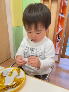 とても夢中でびりびり破っていますね![]()