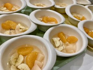 おやつはフルーツポンチです。大好きな果物がたくさん入っているので、子ども達はとても嬉しそうに食べてくれていました♡