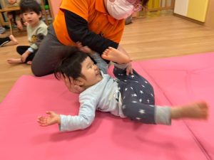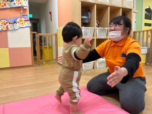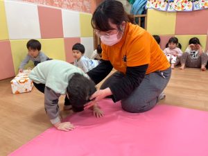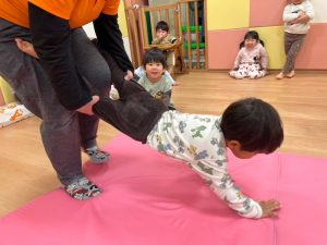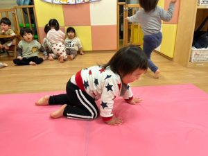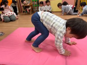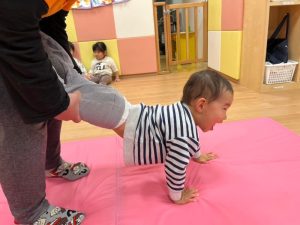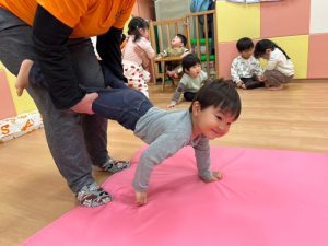 手押し車がまだ難しくて出来ないお友だちは高這いやハイハイをして保育者の元へ行