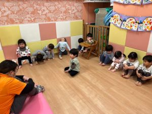 まず初めは、保育者の真似をしてお山座りで挨拶からスタート