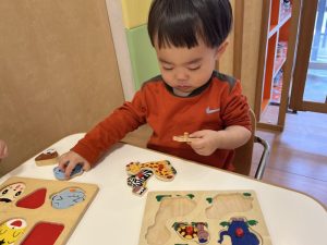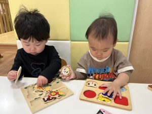 隣のお友だちとパーツが入れ替わってしまうこともありますが、今は正しい遊び方よりも、子どもたちが好きなように遊ぶ姿を見守るようにしています