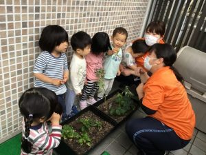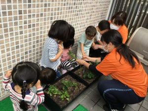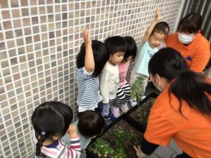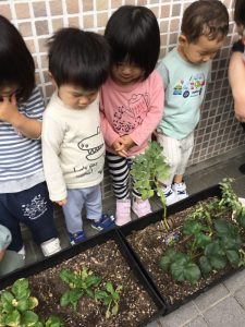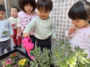 「大きくなーれ」言いながらと水やりを行なった子どもたち😆