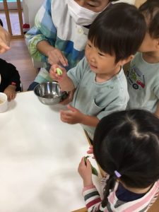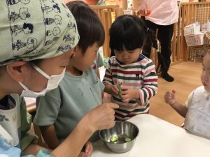「おねがいします」と持って行き、えみこ先生と一緒にそら豆の皮を剥いて中身を出しました