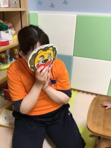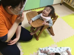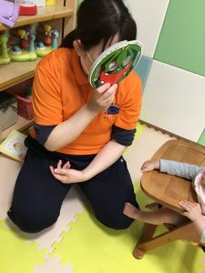 一番小さい月齢のお友だちも顔を上げて保育者のお面絵本に夢中です![]()