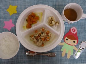 (写真は離乳食後期です。年齢によって形、固さ、盛り付け量を変えて、提供しています。)