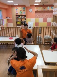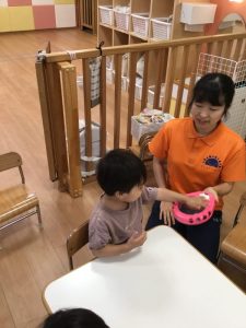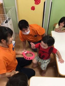 「〇〇ちゃん!」「〇〇くん!」とお名前が呼ばれると、タンバリンを使い「はぁい」とお返事します🤚