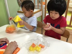 ビニール袋にくしゃくしゃ〜と丸めた花紙を入れます😆上手に丸めて入れることができました!