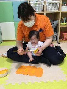 「モミモミ」「ツンツン」「ムニムニ」と絵の具の感触を楽しみながら、画用紙いっぱいに絵の具を伸ばし、ハロウィンのカボチャを作りました🧡