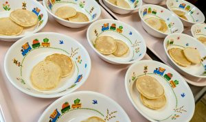 (写真は離乳食後期です。年齢によって盛り付け量を変えて、提供しています。)