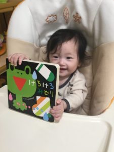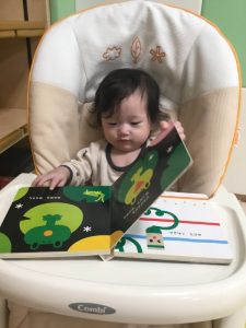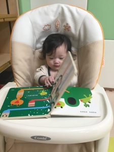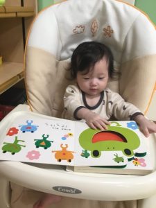 さて、今日の絵本ブログはももぐみさんのお友だちが、ラックに座って絵本を視聴している様子を