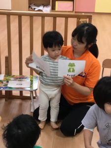 『dog』『cat』『rabbit』『frog』…と集中してピクチャーカードを見る子どもたち。