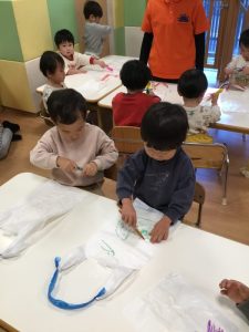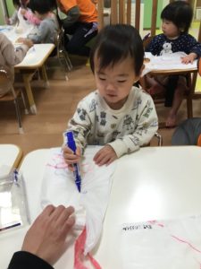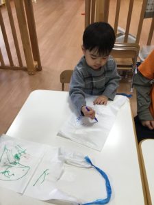 スーパーの袋に紐をつけた凧に油性ペンで絵を描いていきます✒️