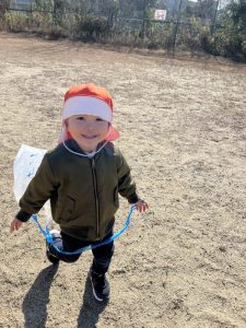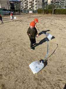 「今日はこの前作った凧を使って、凧あげするよー!」と保育者から言われると、