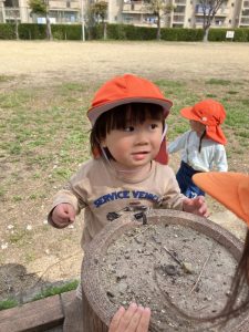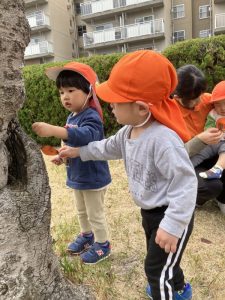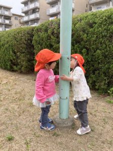団地裏の公園には大きな木があるのですが、そこの穴が気になり触ってみるお友だち😊