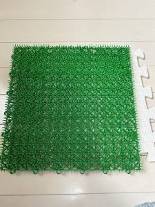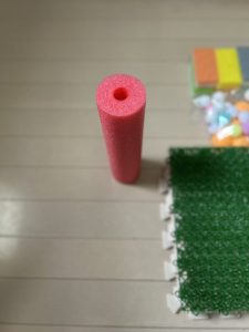 ジョイントマットに、スポンジ、芝生、プールスティック、様々な素材を貼り付けていきます♪