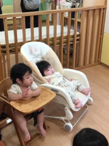 保育者がお誕生日会の準備をしている様子を見てワクワクしながら準備ができるのを待っていたお友だち😆