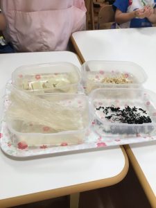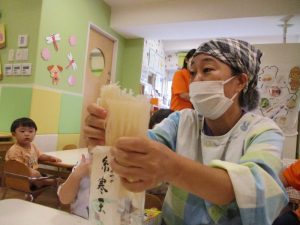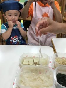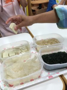 調理師のえみこ先生が「寒天って知ってる?見たことある?」と言いながら、みんなに見せてくれました![]()