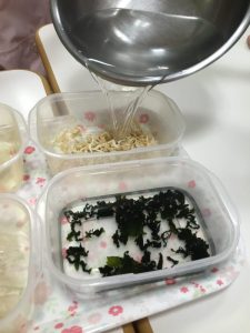 わかめ、高野豆腐、寒天、切り干し大根に水を入れていきます。