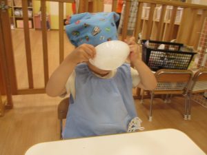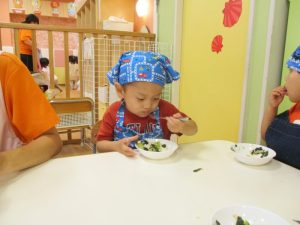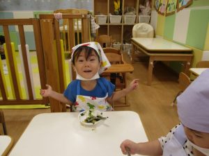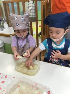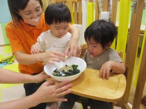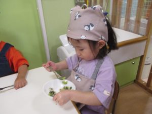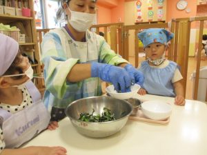 さて今回は、0.1歳児クラスのの食育活動の様子と2歳児クラスのクッキングの様子をお届けします![]()