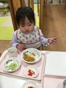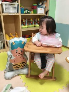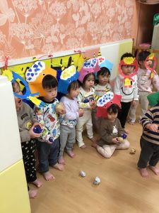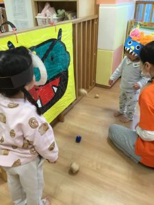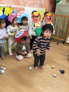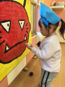 絵本が終わると、豆まきの豆を見せてもらい、自分の歳より一つ多く食べることで、健康で丈夫な体になることを教えてもらいました😊