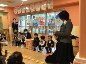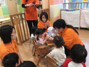 最後はいちご組さんから、プレゼントをもらったりんご組さん。
