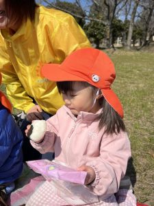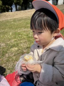 噴水公園ではまずは、みんなで朝のおやつを食べました🍘