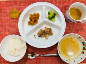 サンライズキッズ保育園 ◎給食の様子 苦手なナスも、ケチャップで煮込み甘味もありみんな残さずに食べる...