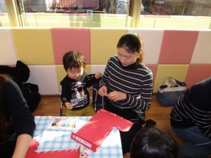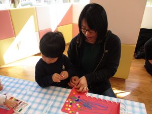 お歌を歌ったり、くつ下の製作でお絵描きやひも通しをしたり![]()