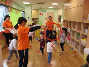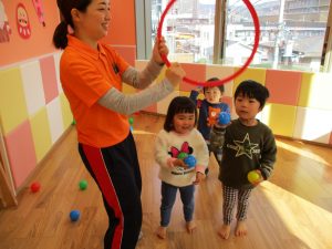 ボールをフープやかごの中に入れて遊んでいます![]()