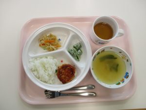2月4日(月)のこんだて ご飯 味噌汁 豆腐ハンバーグ 切り干し大根の煮物 スナップエンドウのマヨネ...