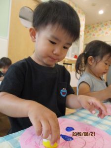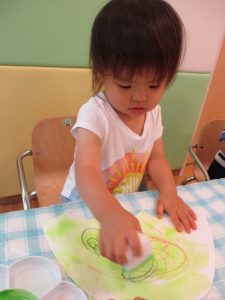 ポンポンポンと色々な色を使い、楽しそうな子どもたち(*^▽^*)