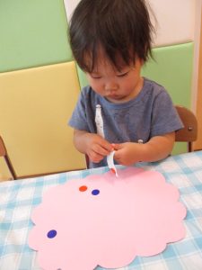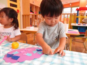 2歳児のお友だちはちぎった折り紙をのりで貼りました!!