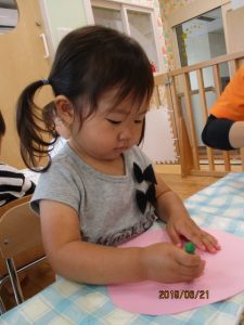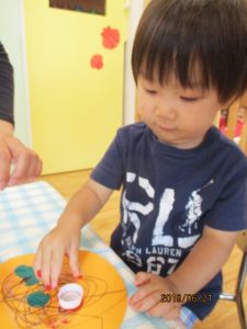 1歳児のお友だちはお花にシールを貼りましたよ(#^.^#)