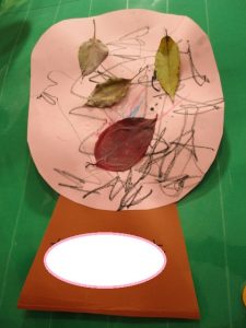 木に好きなように模様を描き、自分たちで拾ってきた枯れ葉を
