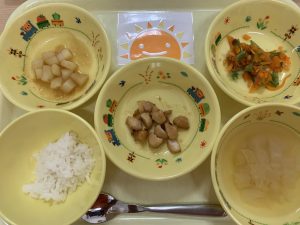 ※誕生日会メニューの鶏のから揚げは大人気で、みんな大好きです♪お肉大きく切って揚げた方がジューシーに仕上がりますが、小さく切って揚げると火の通りも早く、子どもも食べやすくなります。