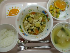 ご飯 味噌汁 豆腐の中華煮 かぼちゃサラダ オレンジ