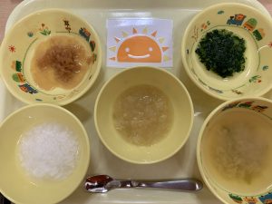 粥 味噌汁 じゃが芋煮 青菜の煮浸し りんごすりおろし