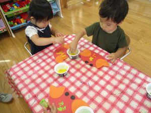 いちご組さんは保育室にも貼っていた カニ? を作りました![]()