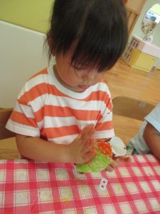 そして最後は小松菜スタンプでカニ?さんにお洋服を着せてあげました![]()