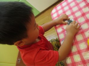 お母さん指でノリを取ります♪目や耳をペタペタ