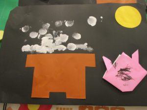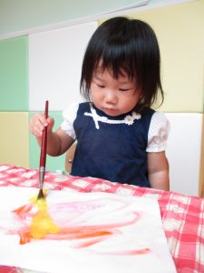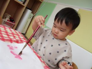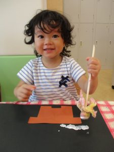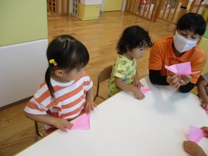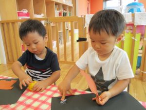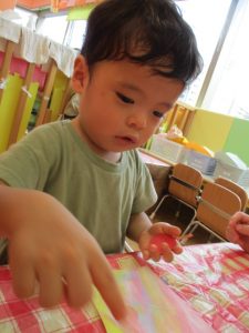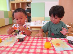 りんご組さんは少し難しい折り紙に挑戦したり、いちご組さんは感触が苦手なノリや絵の具を使ったり、