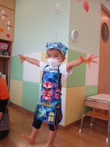 エプロン、マスク、バンダナつけてもらい、準備OK?![]()