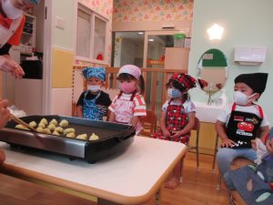 そしてホットプレートの上で丸めたお芋(団子)を先生に焼いてもらいました!