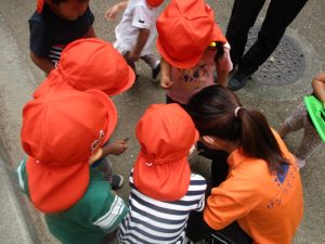 広場に着くと「せんせい なんか いるよ!」と![]()