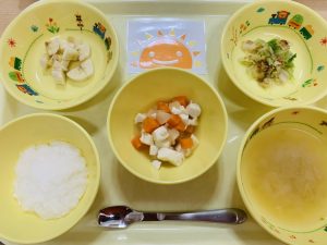 粥 味噌汁 おでん キャベツのおかか和え バナナ