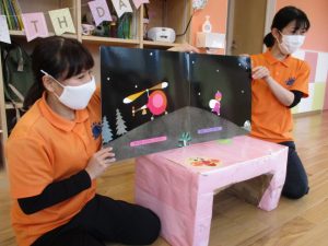 先生たちからの出し物は巨大絵本<まどからのおくりもの>でした