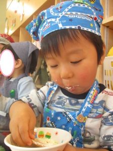 リンゴ組さんはエプロンもすぐ身につけ、とっても楽しんでくれています