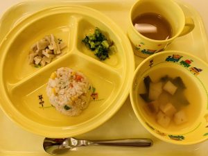 鮭チャーハン 味噌汁 高野豆腐の煮物 ブロッコリーのおかか和え