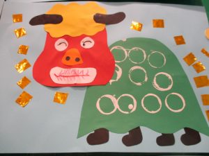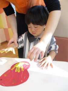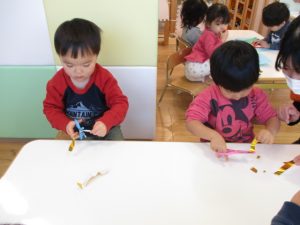 最後は獅子舞の周りに貼るキラキラの折り紙をはさみで切りました✂