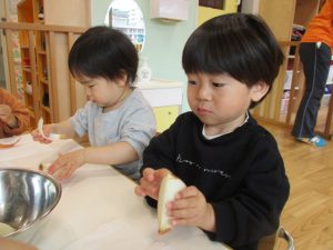 手先も器用なリンゴ組さんは上手にチーズをちぎっていきます![]()